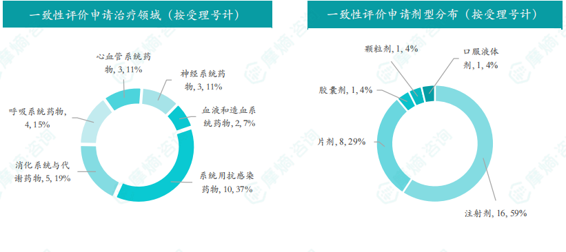 根据摩熵数据数据库统计,2025年4月共有17个品种(按受理号计27项)一致性评价申请获CDE承办,申请品种主要为系统用抗感染药物,申请剂型主要为注射剂。
