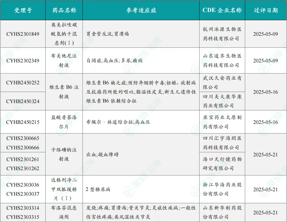2025年5月通过/视同通过一致性评价达七家品种信息一览表