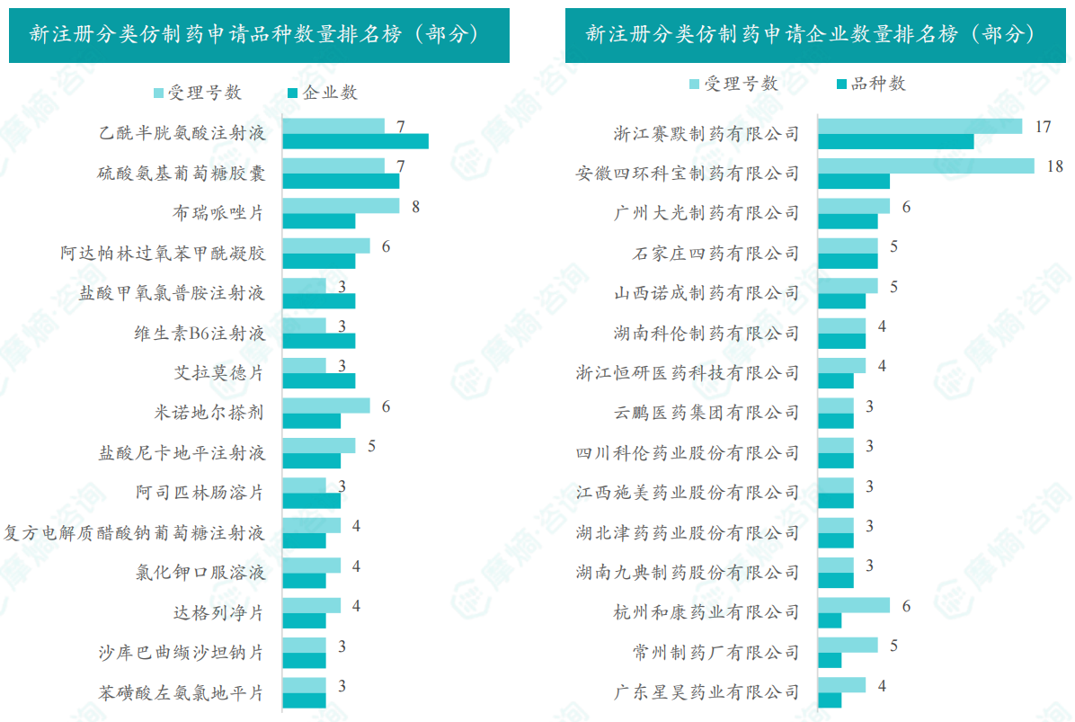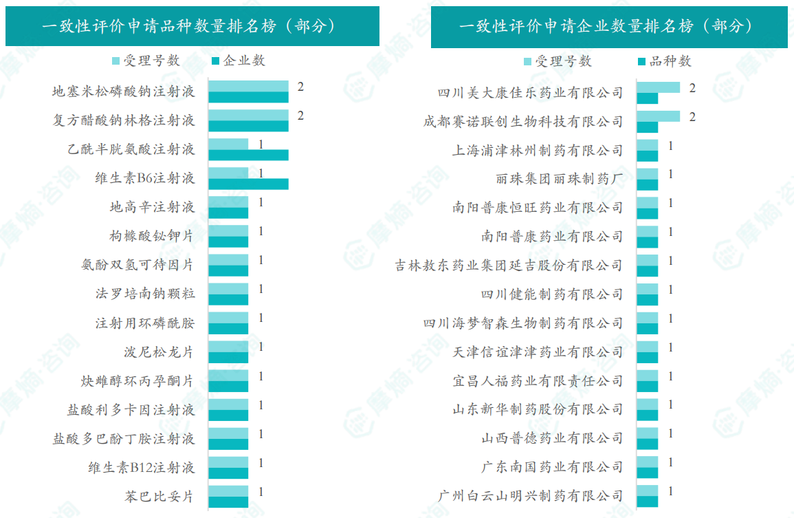 地塞米松磷酸钠注射液、复方醋酸钠林格注射液、乙酰半胱氨酸注射液和维生素B6注射液为申请企业数最多的品种,有2家;各企业申请品种均为1个。