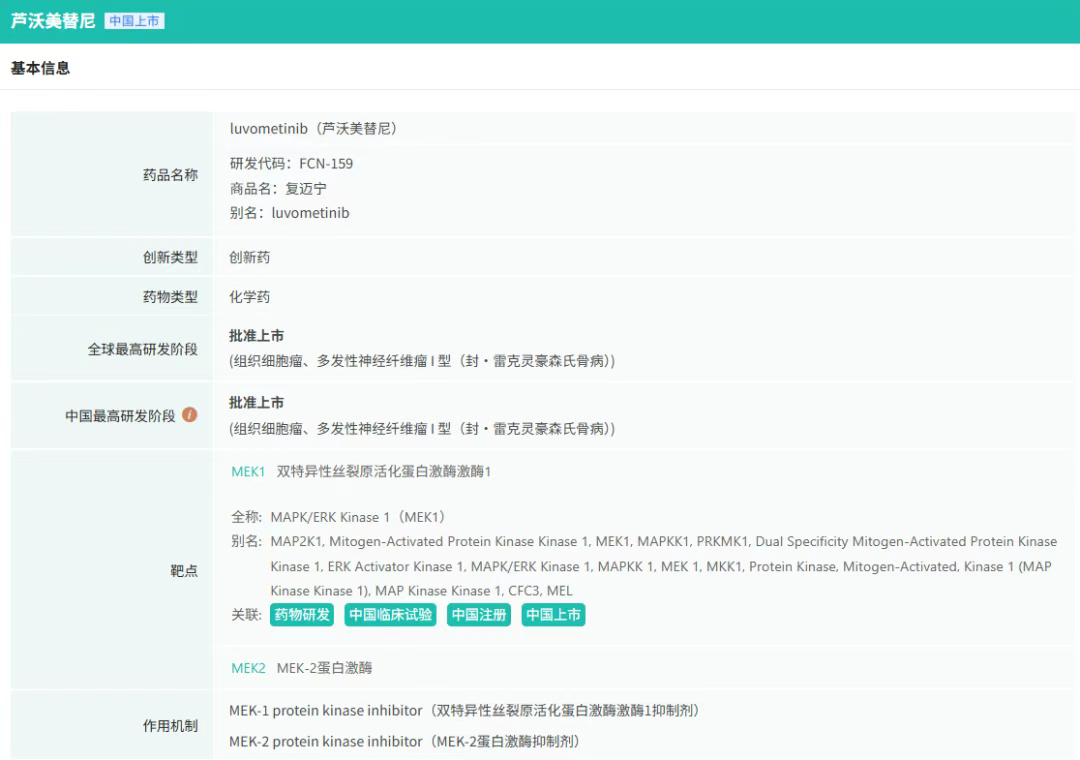芦沃美替尼(FCN-159)是复星医药自主研发的新型小分子化学药物,为一款MEK1/2选择性抑制剂,可以抑制RAS通路异常引起的肿瘤增殖,拟主要用于晚期实体瘤、I型神经纤维瘤、树突状细胞和组织细胞肿瘤、低级别脑胶质瘤等的治疗。