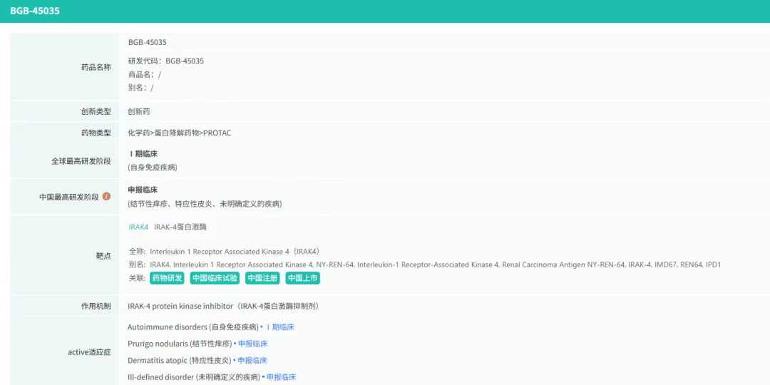 BGB-45035片 是一款靶向IRAK4的蛋白降解剂(IRAK4 CDAC),该产品此前于2024年8月首次在中国获批IND,用于治疗中重度特应性皮炎。IRAK4是一种支架激酶,处于先天性免疫反应与适应性免疫反应的交汇点,通过其激酶活性和支架功能执行多重作用。有研究表明,IRAK4是Toll样受体(TLRs)和IL-1受体介导的炎症发生中的关键性蛋白。