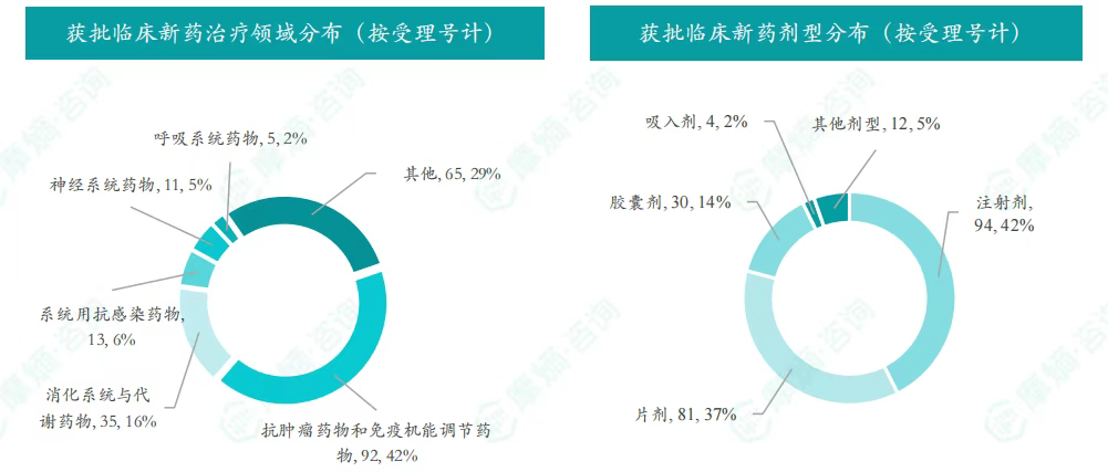 根据摩熵医药数据库统计,2025年5月共有141款新药获批临床(共计221个受理号),较上个月减少了25款,其中包括65款化药,72款生物制品,4款中药。