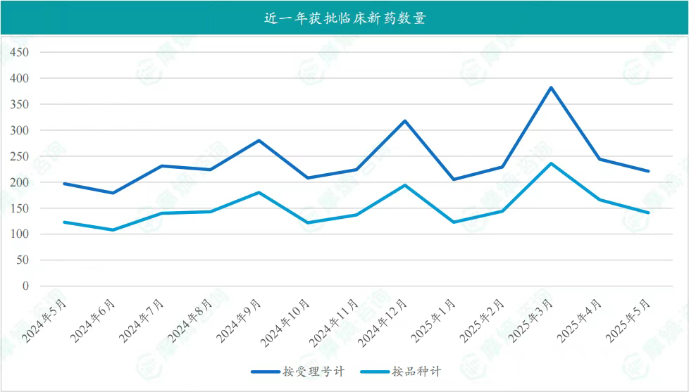 - 2025年5月共有141款新药获批临床,较上个月减少了25款;