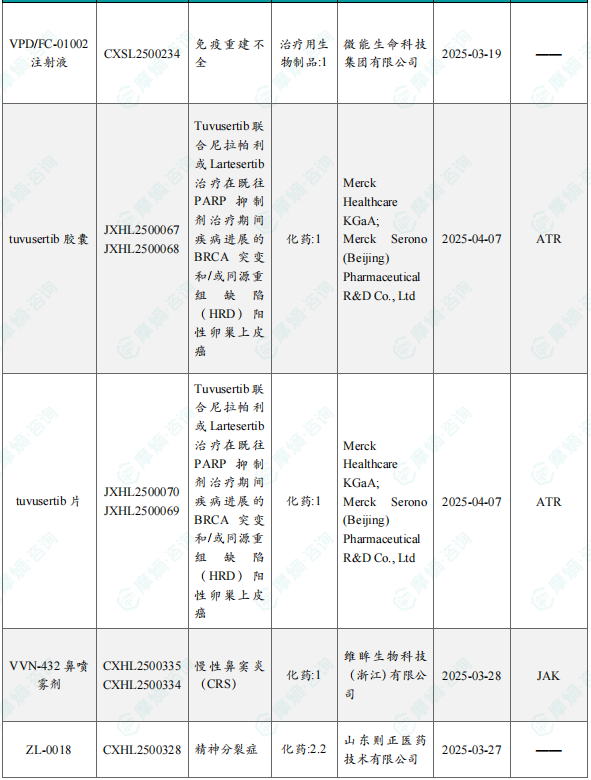 6月13日,CDE官网公示:德国默克(Merck KGaA)的Lartesertib片剂获得临床试验默示许可,联合Tuvusertib治疗在既往PARP抑制剂治疗期间疾病进展的BRCA突变和/或同源重组缺陷(HRD)阳性卵巢上皮癌患者。公开资料显示,Lartesertib片剂是一款ATM抑制剂,研究显示,在ATM缺失的肿瘤细胞中,ATR抑制剂可以产生合成致死效应,在导致ATM缺失肿瘤细胞死亡的同时,并不影响正常细胞。