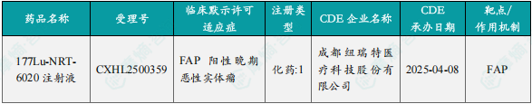 6月18日,CDE官网公示:纽瑞特医疗的177Lu-NRT-6020注射液获得临床试验默示许可,用于FAP阳性晚期恶性实体瘤。公开资料显示,177Lu-NRT-6020注射液是纽瑞特医疗首批进行中美双报的放射性配体疗法药物,能够特异性地与FAP(成纤维细胞激活蛋白)结合,诊断和治疗FAP阳性表达的晚期实体瘤。
