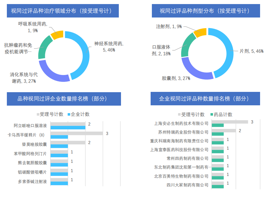 本周视同通过仿制药一致性评价的品种主要集中在神经系统用药和消化系统与代谢药,共计占比约73%,还包括抗肿瘤药和免疫机能调节药、呼吸系统用药2大治疗领域;本周视同通过的剂型主要为片剂,还包括胶囊剂、口服液体剂和注射剂;从品种层面来看,阿立哌唑口服溶液为过评企业最多的品种,有2家企业视同通过,分别为上海安必生制药和重庆科瑞南海制药;从企业层面来看,视同通过的企业包括苏州特瑞药业、常州四药制药、东北制药集团沈阳第一制药和北京百美特生物制药等8家企业。