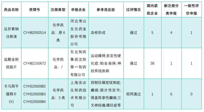 除上面提到的达肝素钠注射液外,本周首次过评仿制药的还有盐酸金刚烷胺片和卡马西平缓释片,分别由东北制药集团沈阳第一制药和上海安必生制药拿下。其中,酸金刚烷胺片至此国内获批企业已达38家。