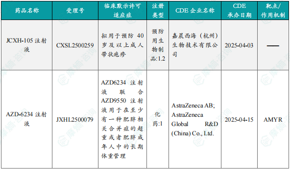 6月24日,CDE官网公示:阿斯利康的AZD-9550注射液获得临床试验默示许可,AZD6234注射液联合AZD9550注射液用于在至少有一种肥胖相关合并症的超重或者肥胖成年人中的长期体重管理。公开资料显示,AZD-9550注射液是每周一次的合成GLP-1/胰高血糖素(GCG)双受体激动剂。