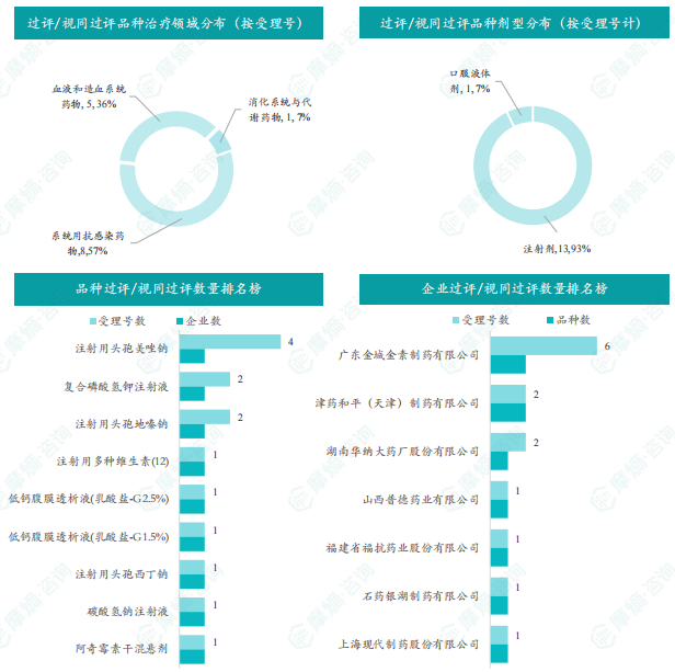 本周过评/视同过评品种主要为系统用抗感染药物;过评/视同过评产品剂型主要为注射剂;本周注射用头孢美唑钠过评/视同过评受理号数量最多达4个,本周各品种过评/视同过评企业相同均为1家;本周广东金城金素制药有限公司和津药和平(天津)制药有限公司企业过评/视同过评品种数最多达2种,本周过评/视同过评企业共包括广东金城金素制药有限公司、津药和平(天津)制药有限公司和湖南华纳大药厂股份有限公司等7家企业。