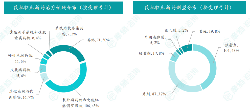- 6月获批临床受理号数量最多的新药为抗肿瘤药和免疫机能调节药物,有106个,占比为45%;