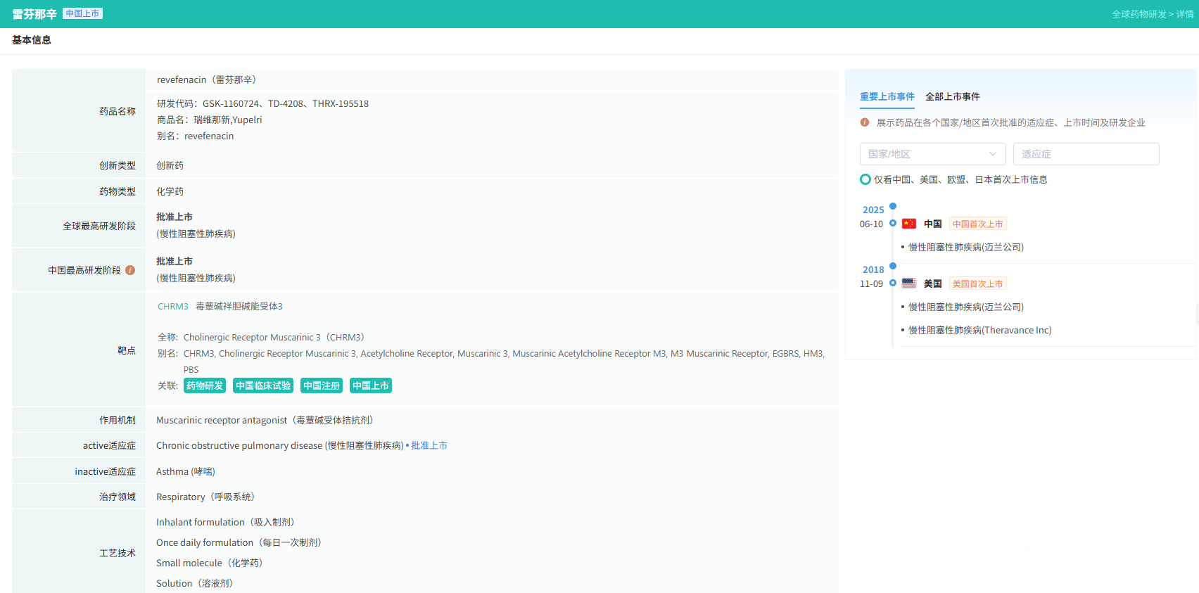瑞维那新是一种长效毒蕈碱拮抗剂(LAMA)的雾化剂。它具有高度的肺特异性,在每天只用一次的情况下,能够保持长久的支气管扩张,同时防止毒蕈碱拮抗剂的全身性副作用,例如口干、便秘和尿潴留等。瑞维那新吸入溶液最初由Theravance Biopharma开发,晖致医药在2019年通过合作获得了该产品的雾化剂型在大中华区的独家开发和商业化权。