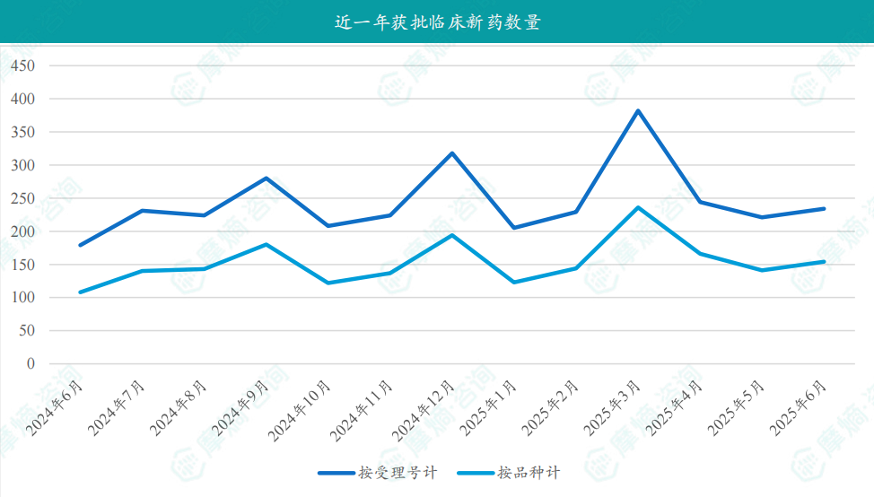 - 2025年6月共有154款新药获批临床(共计234个受理号),较上个月增加了13款;