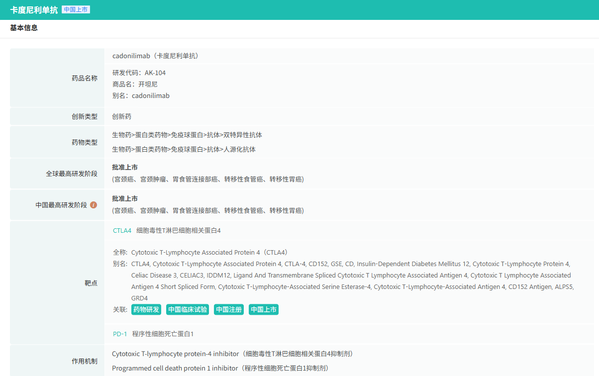 在6月全球创新药研发进展TOP20榜单中,亮点纷呈。6月4日,中国国家药监局(NMPA)官网公示,康方生物研发的PD-1/CTLA-4双特异性抗体卡度尼利单抗注射液的一项新适应症上市申请已获得批准。该药本次获批的适应症为:卡度尼利单抗加含铂化疗联合/不联合贝伐珠单抗用于一线治疗持续、复发或转移性宫颈癌。卡度尼利是康方生物自主研发的PD-1/CTLA-4双特异性肿瘤免疫治疗药物,最早于2022年6月获NMPA批准,用于既往接受含铂化疗治疗失败的复发或转移性宫颈癌患者的治疗。2024年9月,该药再次获NMPA批准联合奥沙利铂和卡培他滨(XELOX)一线治疗不可手术切除的局部晚期复发或转移性胃或胃食管结合部(G/GEJ)腺癌。相关临床研究数据显示,卡度尼利与PD-1单抗联合CTLA-4单抗的联合疗法相比,毒性显著降低,具有明显的安全性和疗效优势。