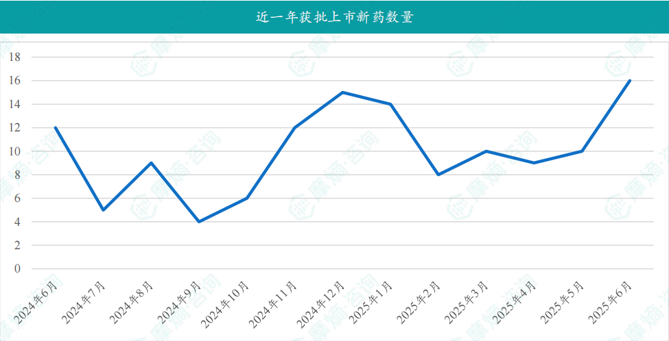 在6月份,国内医药市场迎来了16款创新药物的获批上市,涉及诺华的布西珠单抗注射液,用于治疗糖尿病黄斑水肿(DME)适应症;海创药业自主研发的1类新药氘恩扎鲁胺软胶囊,用于治疗接受醋酸阿比特龙及化疗后出现疾病进展,且既往未接受新型雄激素受体抑制剂的转移性去势抵抗性前列腺癌(mCRPC)成人患者;复星医药1类新药芦沃美替尼片(曾用名:复迈替尼片),适用于朗格汉斯细胞组织细胞增生症(LCH)和组织细胞肿瘤成人患者;恒瑞医药的苹果酸法米替尼胶囊,联合注射用卡瑞利珠单抗用于既往接受含铂化疗治疗失败但未接受过贝伐珠单抗治疗的复发或转移性宫颈癌患者,此外恒瑞医药还有注射用磷罗拉匹坦帕洛诺司琼和注射用瑞康曲妥珠单抗均已获批上市。