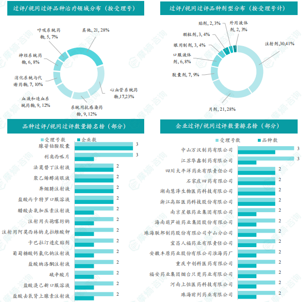 本周过评/视同过评品种主要为心血管系统药物;过评/视同过评产品剂型主要为注射剂;本周腺苷钴胺胶囊和利奥西呱片2个品种过评/视同过评受理号数量多达3个,同时腺苷钴胺胶囊也是本周过评/视同过评企业最多的品种,为3家;本周中山万汉制药有限公司、四川太平洋药业有限责任公司、石家庄四药有限公司、湖南慧泽生物医药科技有限公司和浙江高跖医药科技股份有限公司过评/视同过评品种数最多,为2种,本周过评/视同过评企业共包括中山万汉制药有限公司、江苏华鑫制药有限公司和四川太平洋药业有限责任公司等55家企业。