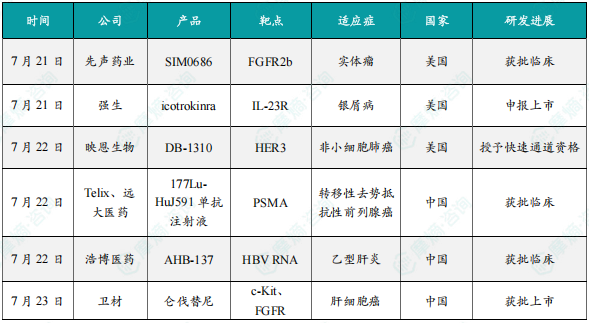 7月21日,先声药业旗下抗肿瘤创新药公司先声再明宣布,其自主研发的靶向FGFR2b的抗体偶联药物(ADC)SIM0686的临床试验申请(IND)已获美国FDA批准。FGFR2b(成纤维细胞生长因子受体2b)是上皮来源的组织中表达的一种跨膜酪氨酸激酶受体,其信号通路失调与各种癌症的发生和进展相关,在胃癌和多种实体瘤中可观察到FGFR2b的蛋白过表达或FGFR2基因扩增。SIM0686为先声再明自有技术平台开发的临床阶段ADC项目,该分子结合了抗体分子的肿瘤特异靶向性,以及拓扑异构酶抑制剂的肿瘤杀伤性,在多项临床前研究中显示出显著抗肿瘤疗效,不仅可抑制FGFR2b表达阳性的肿瘤细胞的增殖,还可通过旁观者效应对FGFR2b阴性的肿瘤细胞发挥杀伤效果。SIM0686目前正在中国开展1期临床研究。美国IND获批后,将有望在美国针对FGFR2b阳性的局部晚期/转移性实体瘤患者开展临床试验。
