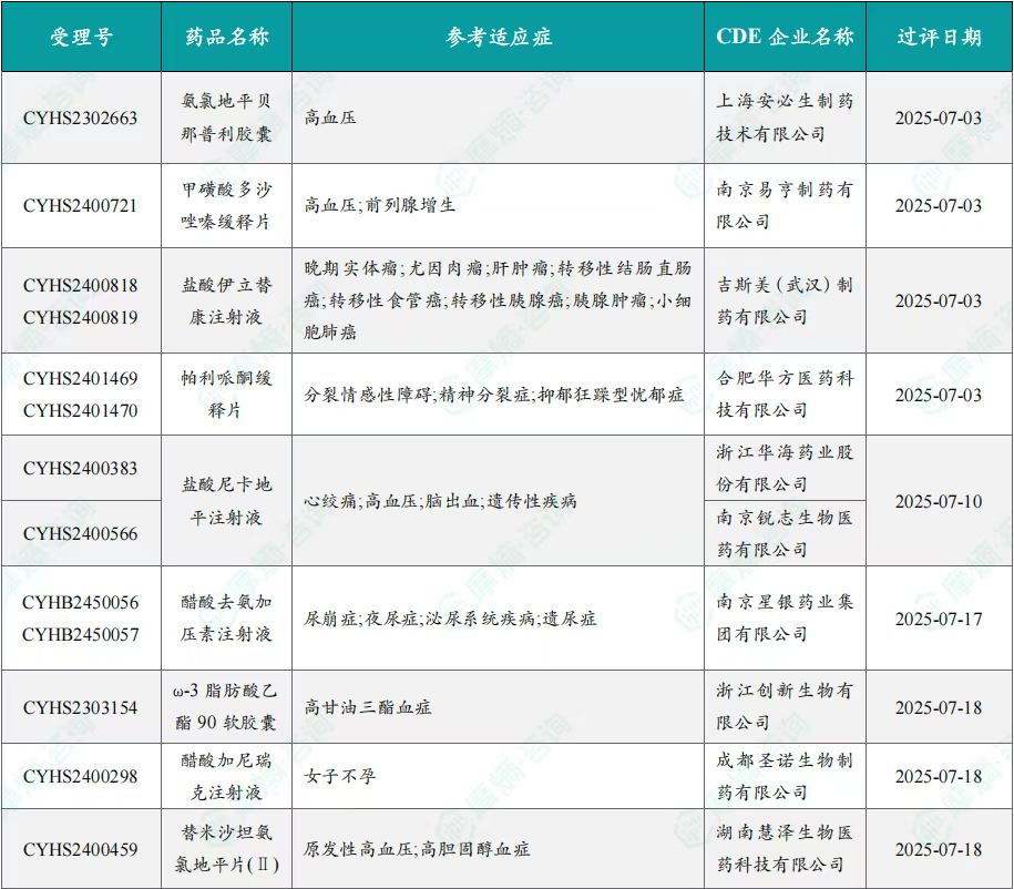 2025年7月一致性评价过评品种信息一览表(部分)