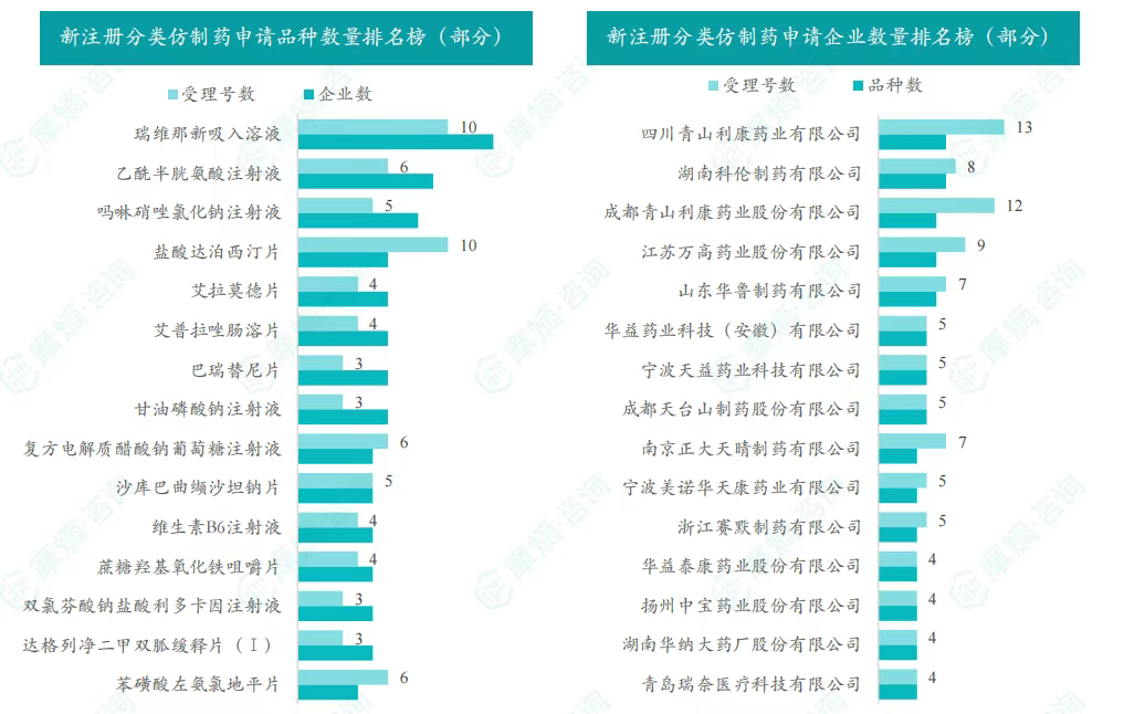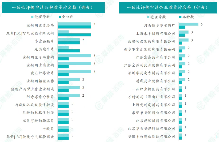 注射用更昔洛韦和尿素[13C]呼气试验诊断试剂为申请企业数最多的品种,有3家;河南新乡华星药厂和上海禾丰制药有限公司是申请品种最多的企业,有2个品种。