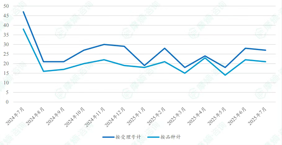 根据摩熵医药数据库统计,2025年7月期间共有453项(共计257个品种)新注册分类仿制药申请获CDE承办,其中新注册分类临床申请13项,新注册分类上市申请440项。