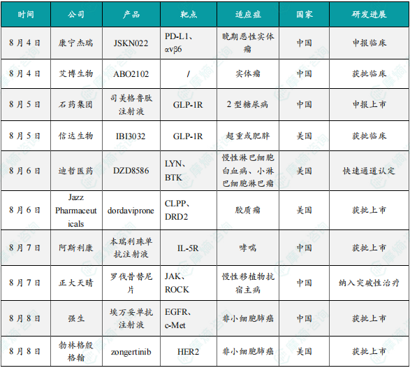 1. 2025年第32周08.04-08.10国内创新药/改良型新药申请临床/获批临床/申请上市/获批上市数据分析