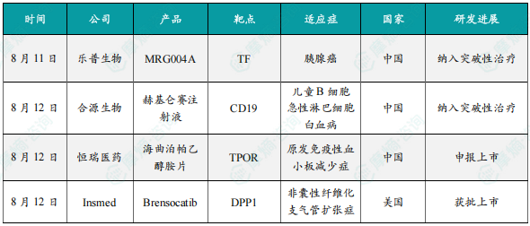 8月12日,恒瑞医药宣布其自主研发的1类新药海曲泊帕乙醇胺片的药品上市许可申请获中国国家药监局(NMPA)受理,适应症为:适用于既往对糖皮质激素、免疫球蛋白等治疗反应不佳的原发免疫性血小板减少症(ITP)成人及≥6岁的儿童患者。海曲泊帕乙醇胺片是一种口服非肽类血小板生成素受体激动剂,通过激活血小板生成素受体介导的STAT和MAPK信号转导通路,促进血小板生成。该产品已在原发免疫性血小板减少症、再生障碍性贫血、化疗所致血小板减少症、有创性操作或手术的慢性肝病伴血小板减少症患者中开展临床研究,以评估在不同血液系统疾病中的作用。海曲泊帕乙醇胺片已获批上市两个适应症,分别为:2021年6月获得NMPA批准用于既往对糖皮质激素、免疫球蛋白等治疗反应不佳的慢性原发免疫性血小板减少症成人患者的治疗,以及用于对免疫抑制治疗疗效不佳的重型再生障碍性贫血成人患者的治疗。此外,该产品用于恶性肿瘤化疗所致血小板减少症适应症(CIT)已获美国FDA授予孤儿药资格。