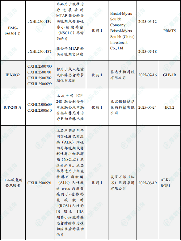8月19日,CDE官网公示:百时美施贵宝的BMS-986504片获得临床试验默示许可,拟用于治疗本品用于既往治疗进展后的MTAP纯合缺失的晚期或转移性非小细胞肺癌(NSCLC)患者的治疗。公开资料显示,BMS-986504片是一款PRMT5抑制剂非降解型分子胶新药,可选择性结合PRMT5-MTA复合物,这是MTAP缺失型癌细胞中的合成致死靶点,同时不影响MTAP野生型细胞。