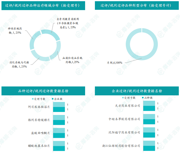 本周过评/视同过评品种包括血液和造血系统药物、消化系统与代谢药物、神经系统药物和全身用激素类制剂(不含性激素和胰岛素);过评/视同过评产品剂型均为片剂;本周各品种过评/视同过评受理号数量均为1个,本周各品种过评/视同过评企业均为1家;各企业过评/视同过评品种数均为1种,本周过评/视同过评企业共包括天方药业有限公司、中峘本草制药有限公司、沈阳福宁药业有限公司和浙江仙琚制药股份有限公司4家企业。