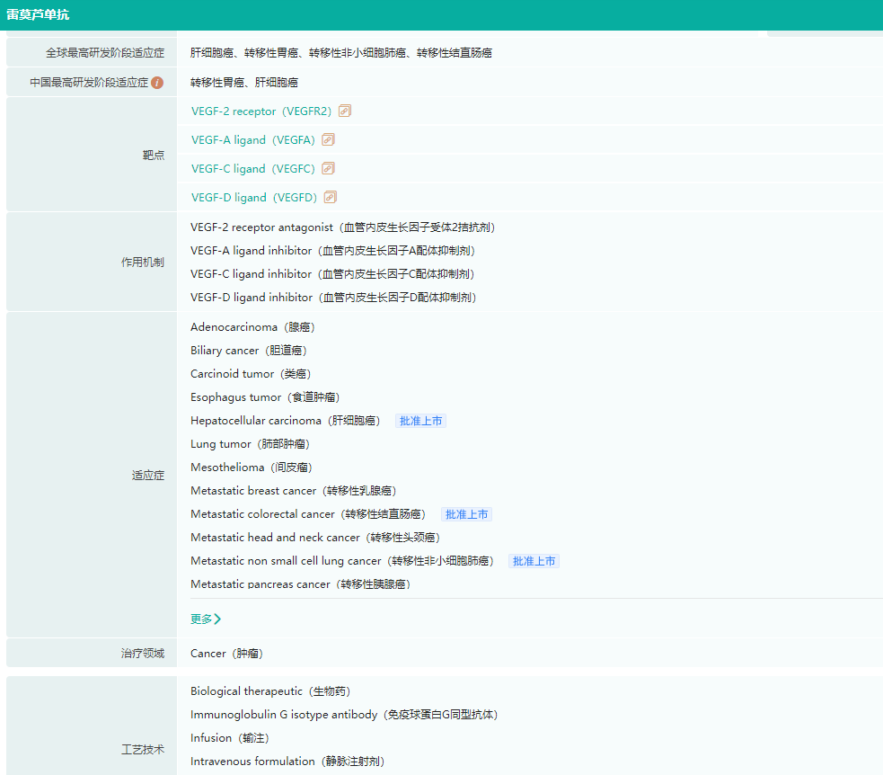 雷莫西尤单抗是一款全人源IgG1单克隆抗体,可与血管内皮生长因子受体2(VEGFR-2)特异性结合,高效阻断VEGF-A与VEGFR-2的结合,亦能够抑制VEGF-C及VEGF-D与VEGFR-2的结合,是国内首个被批准用于晚期胃癌二线治疗的靶向药物。2022年3月,信达生物与礼来公司达成合作,获得雷莫西尤单抗在中国的独家商业化权利。