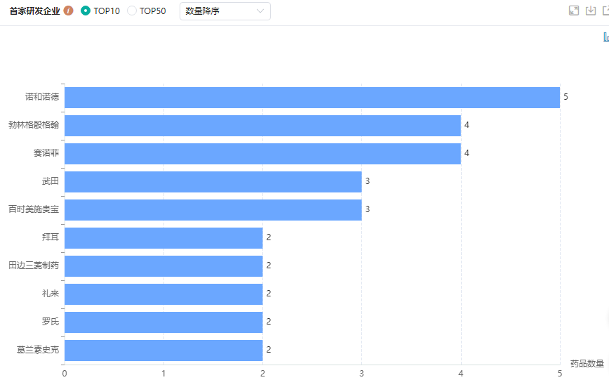 据药融云全球药物研发数据库统计,目前已在国内批准上市的2型糖尿病治疗创新药共计46个,涉及企业26家;其中首家研发TOP10企业有诺和诺德(瑞格列奈+二甲双胍、德谷胰岛素、门冬胰岛素、司美格鲁肽等)、勃林格殷格翰(恩格列净、利格列汀、瑞格列奈等)、赛诺菲(格列美脲、甘精胰岛素)、武田(吡格列酮、伏格列波糖等)、百时美施贵宝(沙格列汀、丙二醇达格列净等)等等。