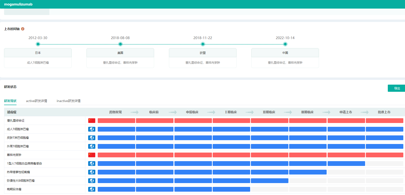 莫格利珠单抗是国内首个也是唯一获批用于治疗SS和MF的靶向CCR4的生物制剂。据药融云全球药物研发数据库显示,莫格利珠单抗在2012年3月首次在日本获批上市,用于治疗成人T细胞淋巴瘤;2018年8月在美国获批上市,用于治疗塞扎里综合征、蕈样肉芽肿。
