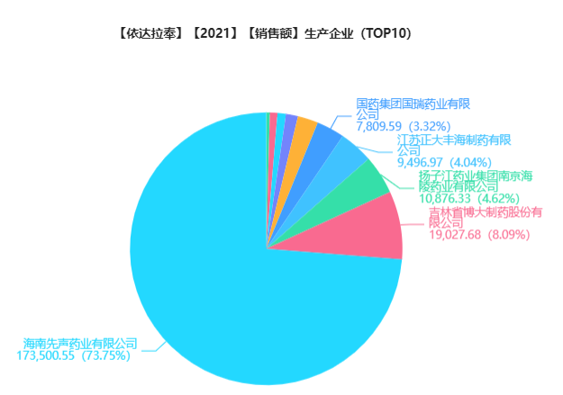 据药融云数据库统计,依达拉奉在全国医院销售(全终端)的销售额曾高达55.48亿元。先声药业、吉林博大、国药国瑞、扬子江等企业先后仿制。2021年,先声药业的依达拉奉医院全终端的销售额高达17.36亿元,以73.75%的市场份额在中国依达拉奉市场排名第一。