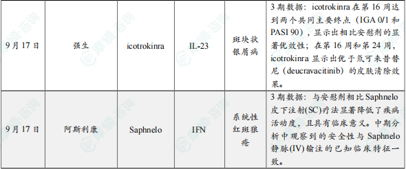 9月17日,强生公布了III期ICONIC-ADVANCE 1和ICONIC-ADVANCE 2研究的最新数据,这两项研究评估了icotrokinra与安慰剂和氘可来昔替尼相比,治疗中重度斑块状银屑病患者的疗效与安全性。这些数据将在2025年欧洲皮肤病与性病学会(EADV)大会上公布。
