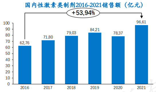 根据药融云数据统计,国内性激素药品市场2016-2019年呈现持续增长态势,CAGR为34.18%,至2019年达到84.21亿元人民币,2020年受疫情影响,市场规模整体萎缩,2021年回暖至96.61亿元。