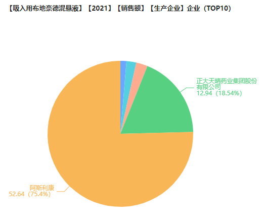 据药融云全国医院销售(全终端)数据库显示,2021年国内医院端市场格局,吸入用布地奈德混悬液原研企业阿斯利康占据75.4%的市场份额,正大天晴占据18.54%,健康元占据2.55%。