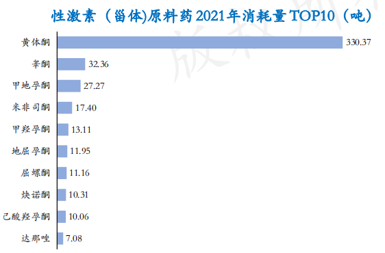 从具体品种来看,黄体酮、睾酮、甲地孕酮在全球原料药消耗量位列三甲,2021年消耗量分别为330.37吨、32.36吨、27.27吨;炔雌醇、雌二醇、屈螺酮为下游制剂全球销售额TOP3活性成分,2021年相应下游制剂全球销售额分别为30.04亿美元、17.83亿美元、17.48亿美元。