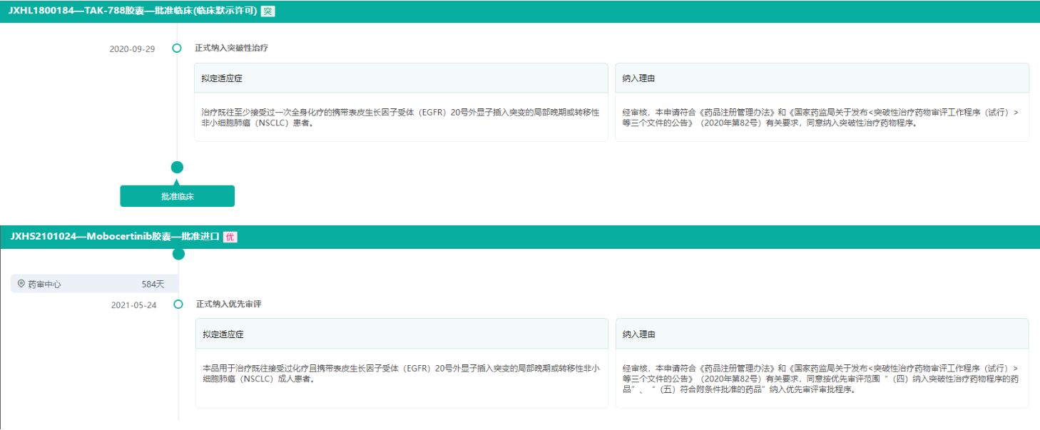 药融云数据显示,在中国,2020年9月,琥珀酸莫博赛替尼胶囊在中国被药品审评中心指定为突破性治疗产品。2021年5月,再次被拟纳入优先审评。本次新药获批上市主要是基于其全球I期、II期以及EXCLAIM延展队列研究。研究结果显示,莫博赛替尼为患者带来了较为显著的生存获益和缓解持续时间延长,且一天一次口服,依从性高,且安全性良好。