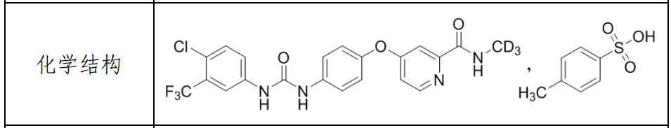 多纳非尼(Donafenib),是利用氢的同位素“氘”的理化优势,将索拉非尼(Sorafenib)分子上的关键代谢靶点吡啶酰甲胺氘代为吡啶酰三氘代甲胺而形成的全新专利药。临床前数据显示:该药既可抑制VEGFR、PDGFR等多种受体酪氨酸激酶的活性,也可直接抑制各种Raf激酶,并抑制下游的Raf/MEK/ERK信号传导通路,抑制肿瘤细胞增殖和肿瘤血管的形成,从而发挥多重抑制、多靶点阻断的抗肿瘤作用。相关专利:WO-2011113203。