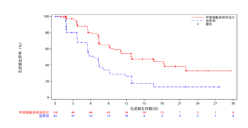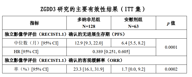 主要研究终点,多纳非尼组和安慰剂组的mPFS分别是12.9和6.4个月(HR 0.389,95% CI 0.251-0.605,p<0.0001),差异有显著性。次要研究终点中,两组的ORR(23.3% vs 1.7%,p=0.0002)有显著差异。中位OS未达到,在治疗后18个月的生存率,分别为88.3%和73.5%。