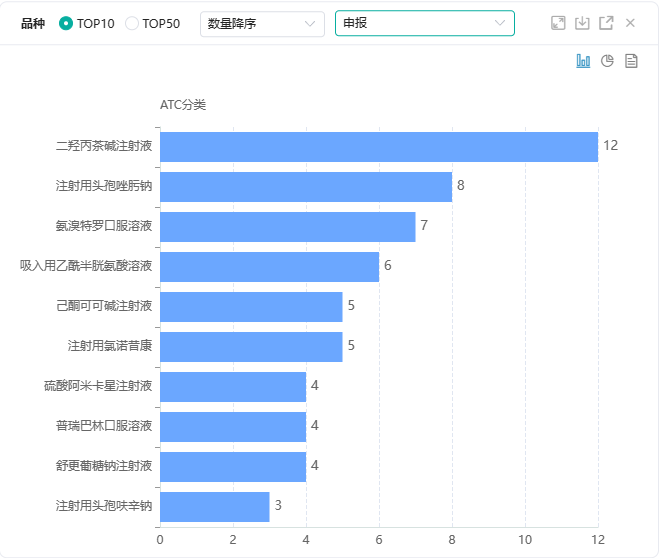 从受理品种来看,二羟丙茶碱注射液、注射用头孢唑肟钠和氨溴特罗口服溶液等品种的相关申报企业数最多。
