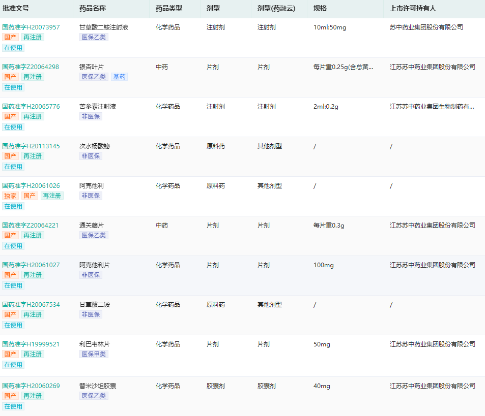 苏中药业集团药品生产批文查询(部分)