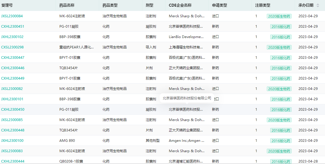 4月化药1类新药获受理品种查询(部分)