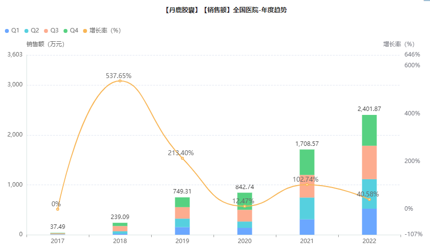 药融云全国医院销售数据库显示,丹鹿胶囊于2017年进入国家医保目录,随后在中国全医院终端开始快速放量,2021年销售额为1708.57万元,同比增长102.74%;2022年更是突破2000万元,销售规模达到2401.87万元,同比增长40.58%。