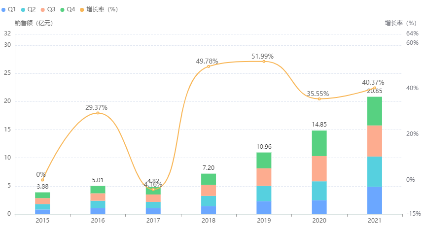 药融云全国医院销售(全终端)数据库显示,2017年-2021年,醋酸钠林格注射液在中国医院全终端的市场规模呈持续稳定增长态势,销售额一路攀升,2021年销售额更是突破20亿大关,达到20.85亿元,同比增长40.37%,2022年有望再创新高。