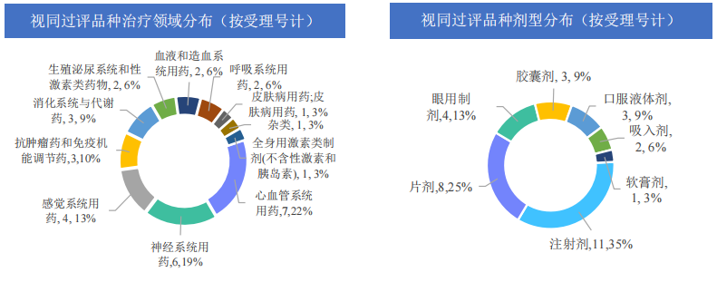 本周,有22个品种视同通过仿制药一致性评价(按受理号计32项)。视同通过的品种主要为心血管系统用药和神经系统用药,共计占比约41%,还包括感觉系统用药、抗肿瘤药和免疫机能调节药和消化系统与代谢药等9大治疗领域。视同通过的剂型主要为注射剂和片剂,还包括眼用制剂、胶囊剂和口服液体剂等5种剂型。
