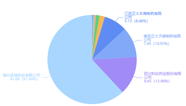 其中,湖北多瑞医药占据了全国医院终端61.94%的市场份额,排名第一;其次是四川科伦药业占据13.98%,南京正大天晴占10.95%;江苏正大丰海制药占8.48%的市场份额。