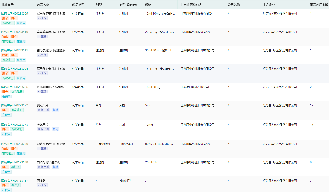 恩华药业药品生产批文查询(部分展示)