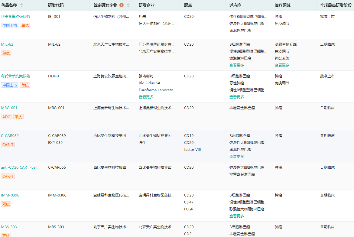 国内布局CD20靶点企业研发进度查询