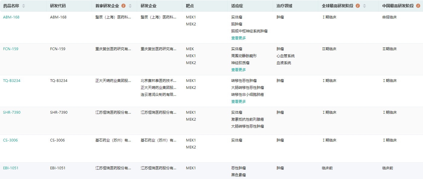 国内在研MEK1/2抑制剂查询(部分,完整内容请登录“药融云数据库www.pharnexcloud.com/?mh”查看)