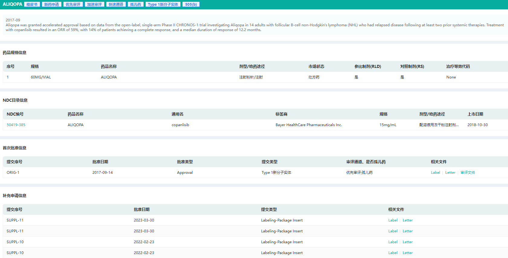 药融云数据库显示,2015年Copanlisib获得美国食品药品监督管理局孤儿药,并获得快速通道和优先审评。2017年9月,Copanlisib获得美国FDA加速批准,用于治疗罹患复发性滤泡性淋巴瘤。