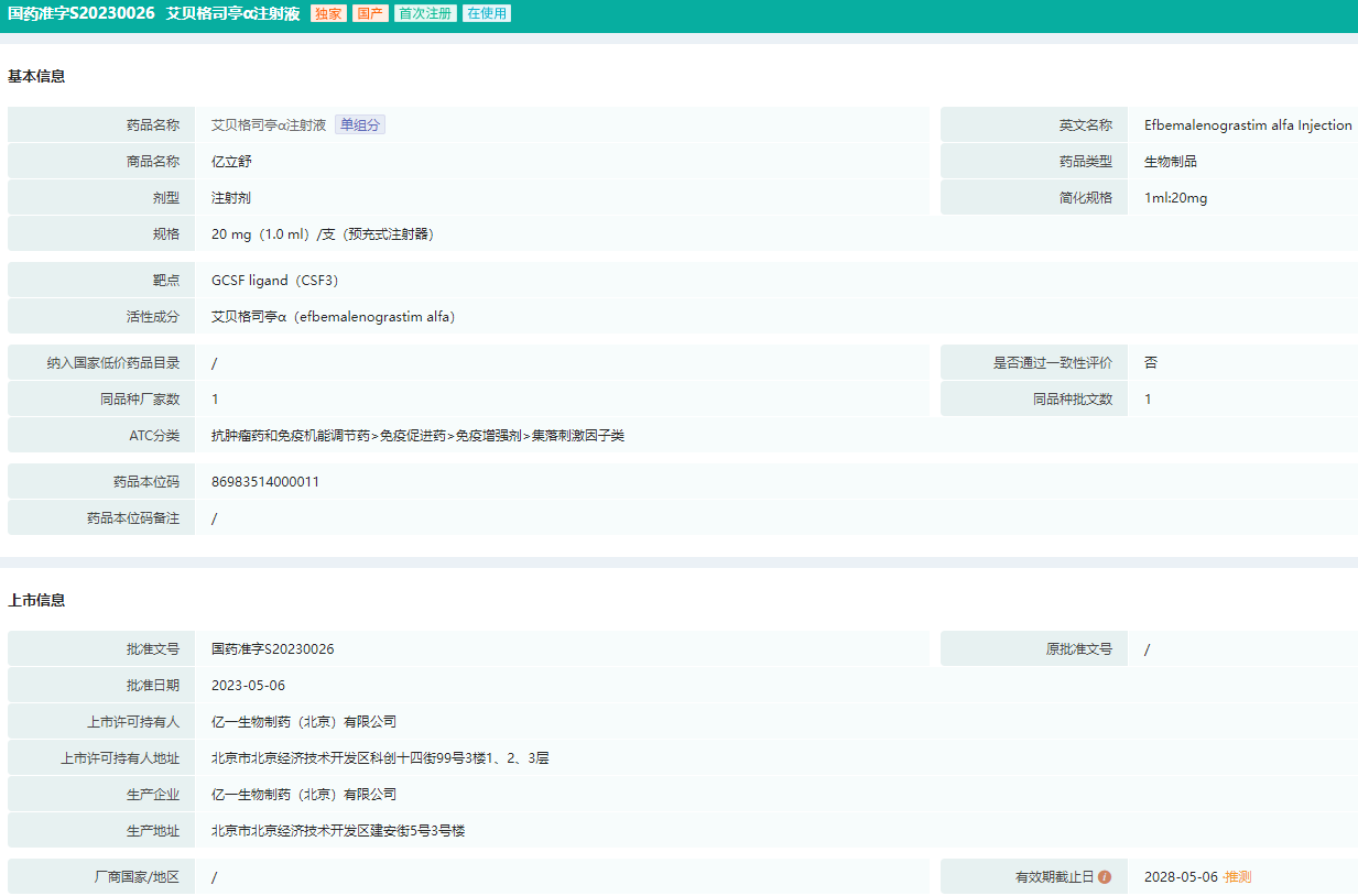 艾贝格司亭α注射液批文(国药准字S20230026)信息